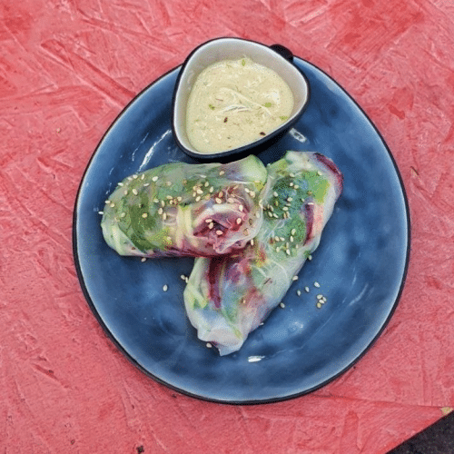 glutenfreie Dumplings aus Reispapier gefüllt mit Tofu-Kimchi-Hack, dazu gibt's Sesam-Miso-Mayo und einen Beilagensalat aus Grünzeug, Zucchini, Rote Bete, Tahin-Soße und Sprossen